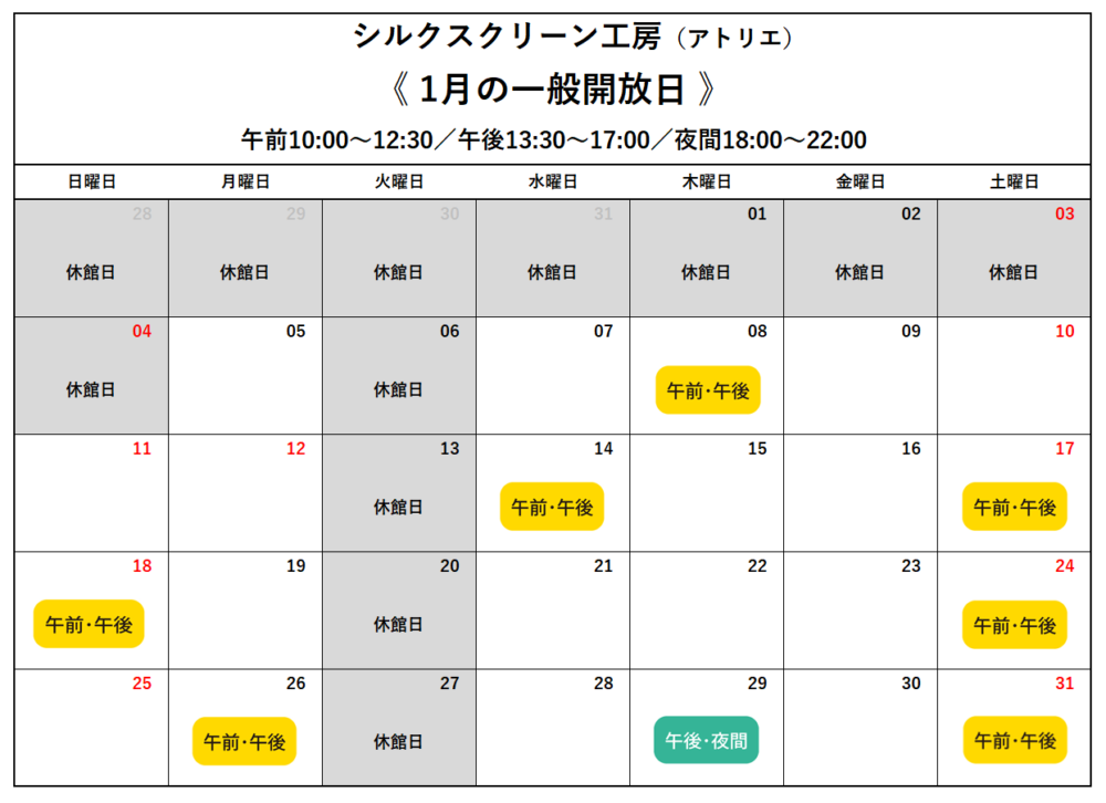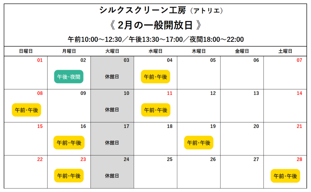 シルクスクリーン工房(アトリエ)2026年1月・2月の一般開放日カレンダーです。